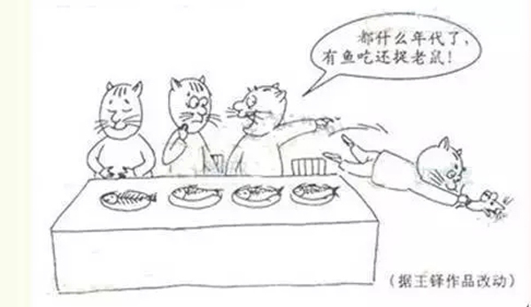 餐桌,许多猫吃鱼,就一只猫捉老鼠,别的猫说:“有鱼吃还捉老鼠?”